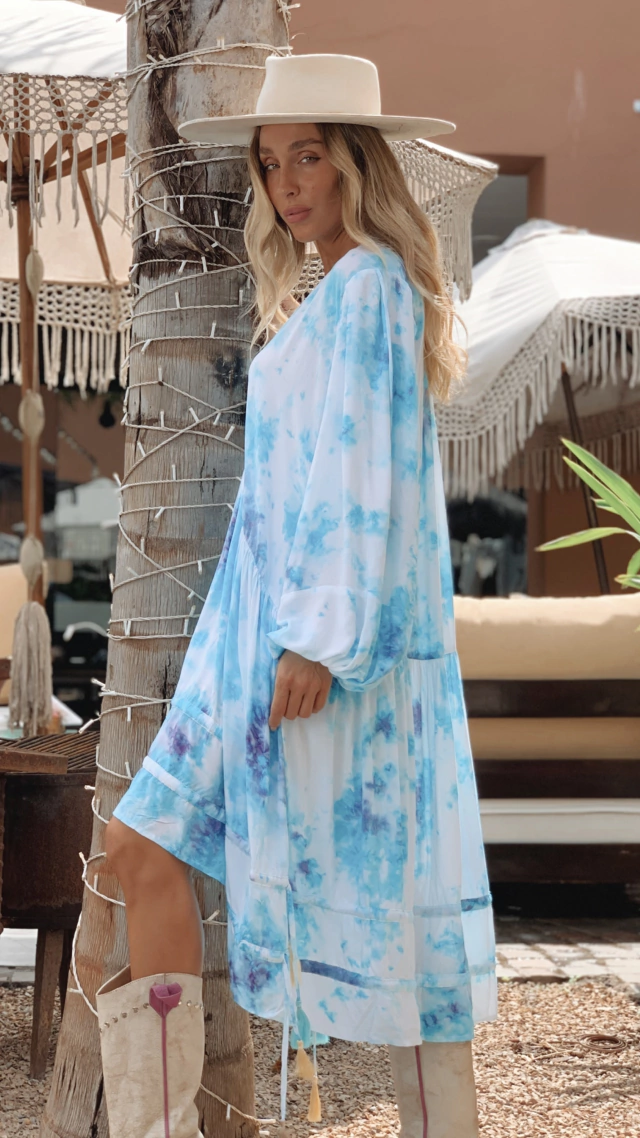 Vestido corto tie-dye tipo poncho, escote V con lazos regulables y apliques de borlas de colores. Confeccionado en voile de rayón. Muy cómodo y fresco. Súper adaptable para diferentes tipos de cuerpos.